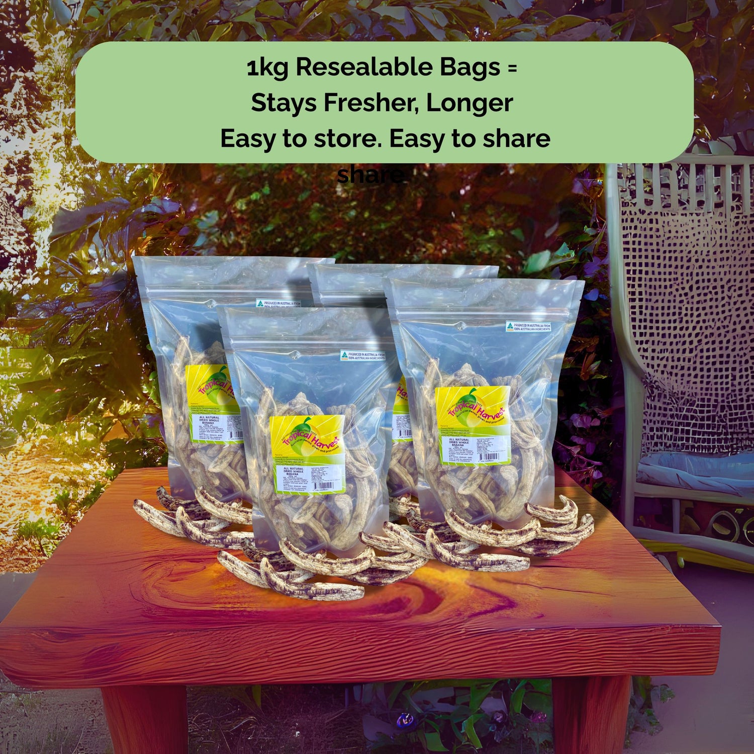 But if you’d prefer to order your dried banana whole in larger non-resealable bags (like 4.5kg or 5kg), we can prepare a custom order for you.