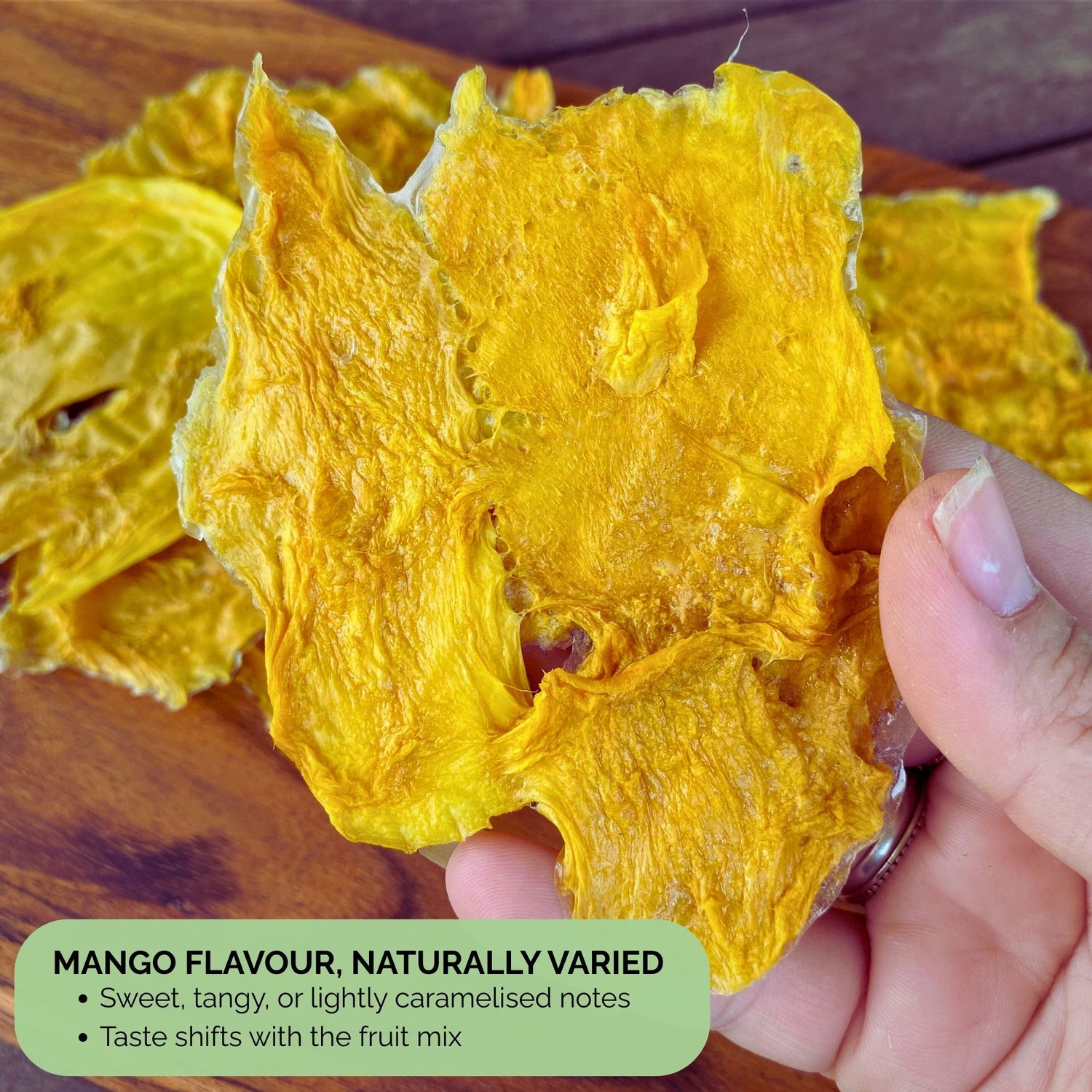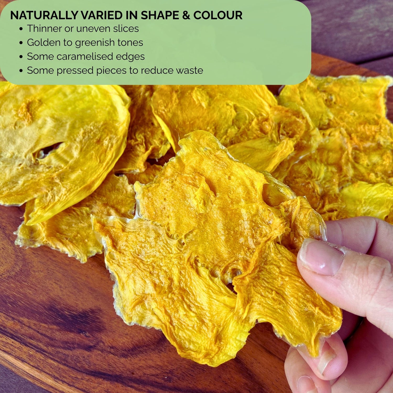 These rustic dried mango slices are slow-dried in small batches, with natural variation in shape, colour, and flavour, from the same farms as our Premium Mango — just less polish, more personality.